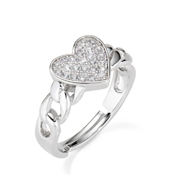 L’anello è valorizzato al centro con un cuore impreziosito da un luminoso pavé di zirconi bianchi.