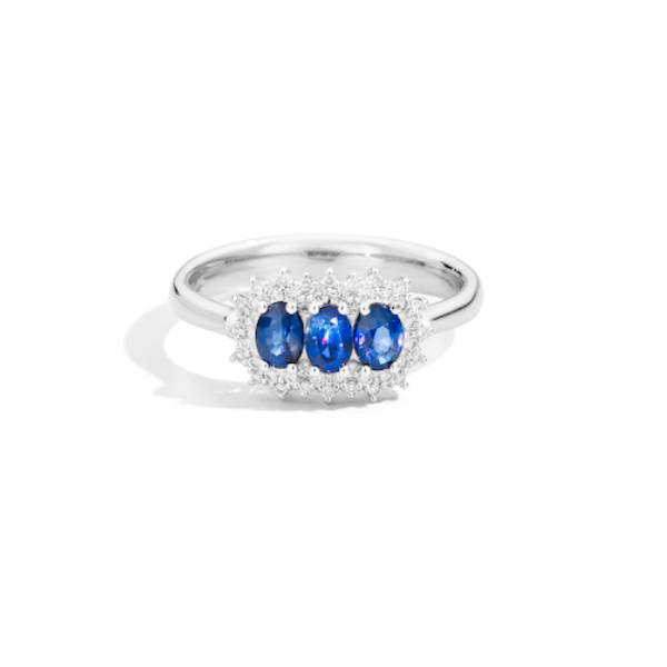 Anello Recarlo della collezione Camelia, modello Trilogy realizzato in Oro Bianco 18Kt con zaffiri e diamanti taglio brillante.