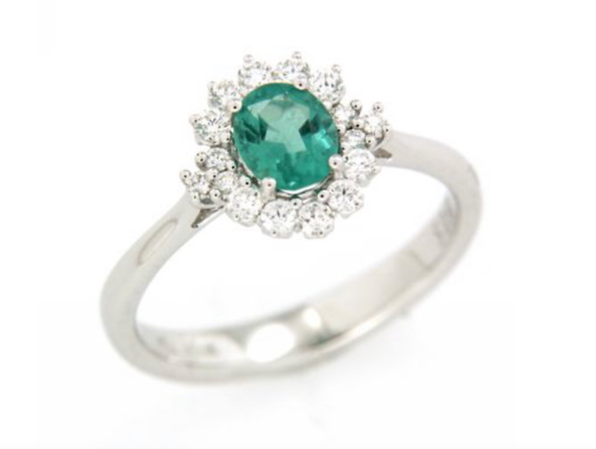 Modello in oro bianco 18 kt. con Smerlado centrale e contorno di diamanti taglio brillante