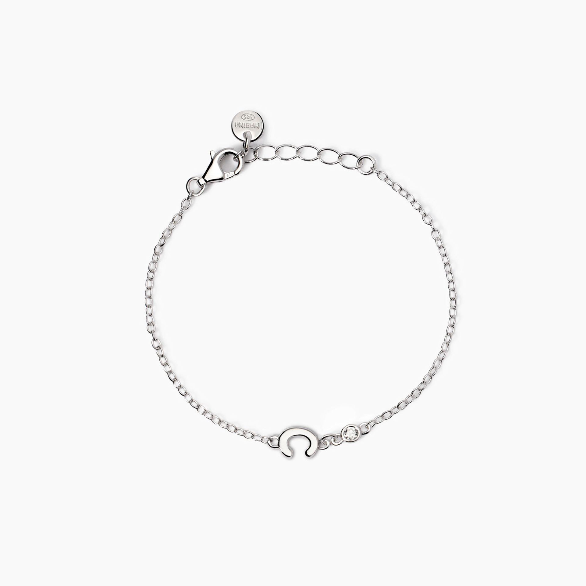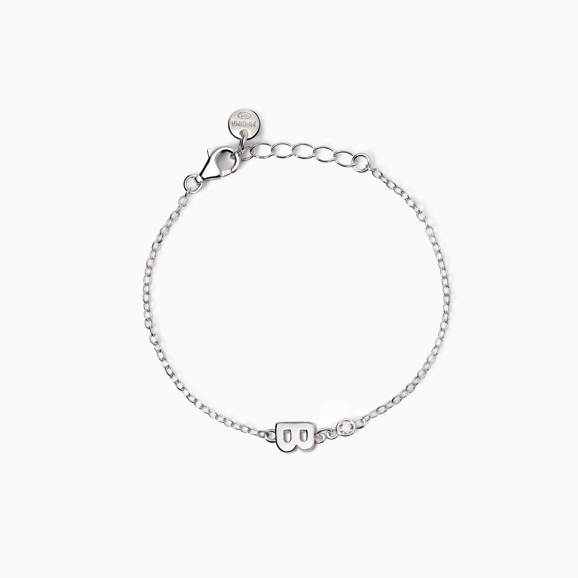 Bracciale regolabile da neonati in argento rodiato con catena rolò, elemento a forma di lettera centrale e diamante Lab-Grown.