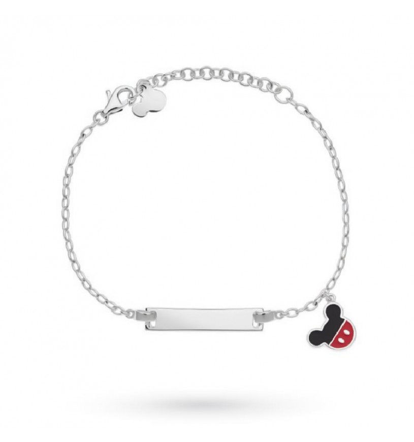 Bracciale Disney da bambino realizzato in argento 925 ipoallergenico con smalto rosso e nero e piastrina centrale. Gioiello della misura di 14cm + 3cm con chiusura comoda a moschettone.