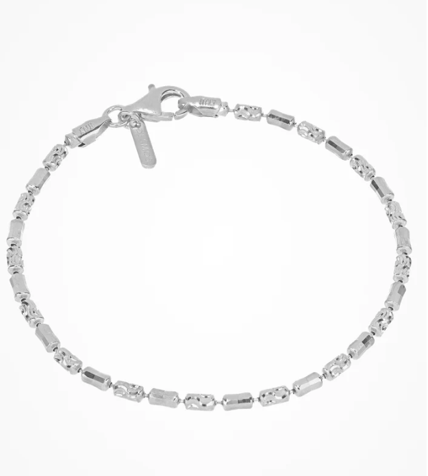 Bracciale in argento con catena a palline ed elementi cilindrici diamantati, per una luminosità che dura nel tempo.