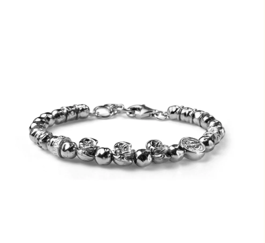 Caratterizzato da 3 roselline e luminose sfere in argento martellato, il gioiello simboleggia il senso di protezione nei confronti dell’amata con il charm San Benedetto.