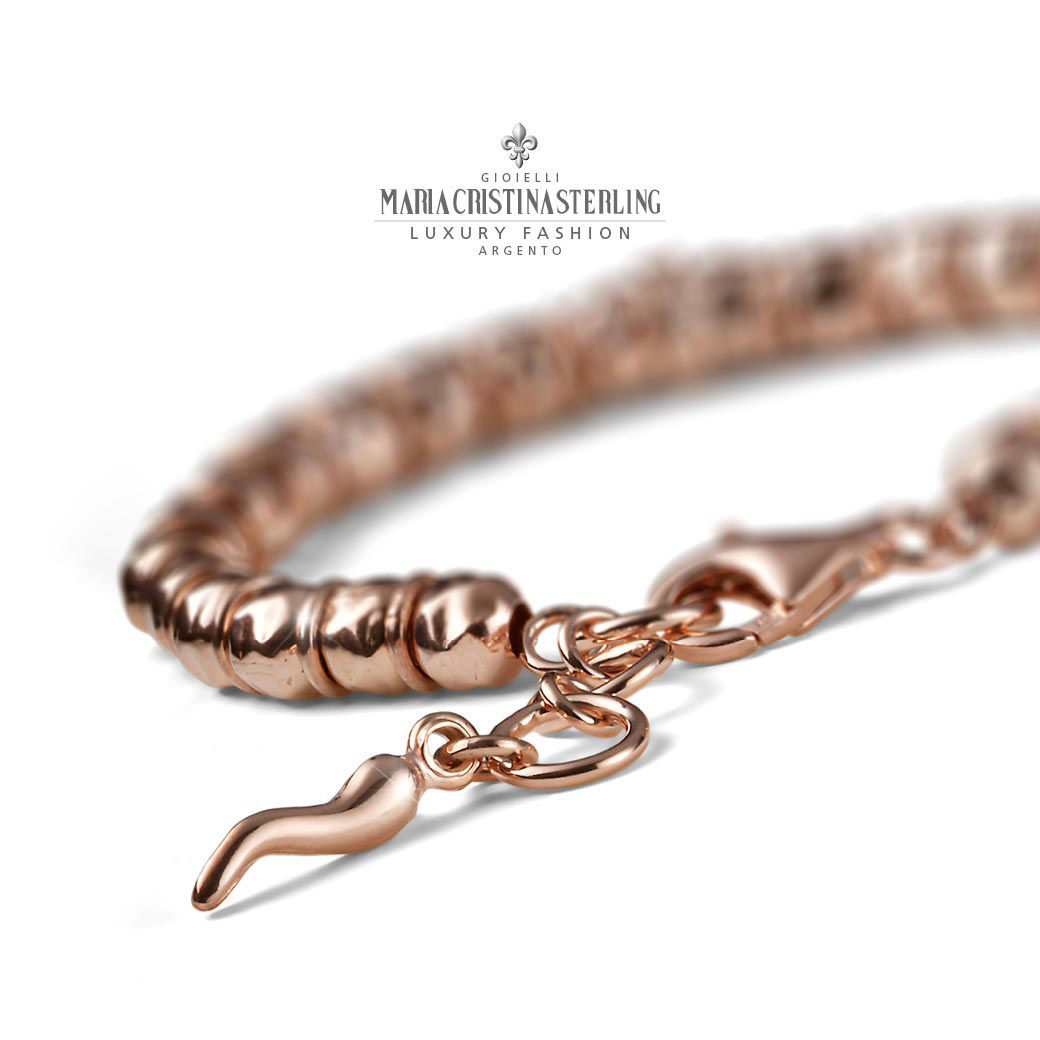 Bracciale donna della collezione Encanto. Brillante accessorio in argento 925‰, dotato di un cornetto che con le sue caratteristiche di buon auspicio porterà fortuna e serenità nella tua vita. Lunghezza 16+3 cm con chiusura a moschettone e con finiture in argento rosa. Disegnato per Maria Cristina Sterling da Alessandro Magrino.