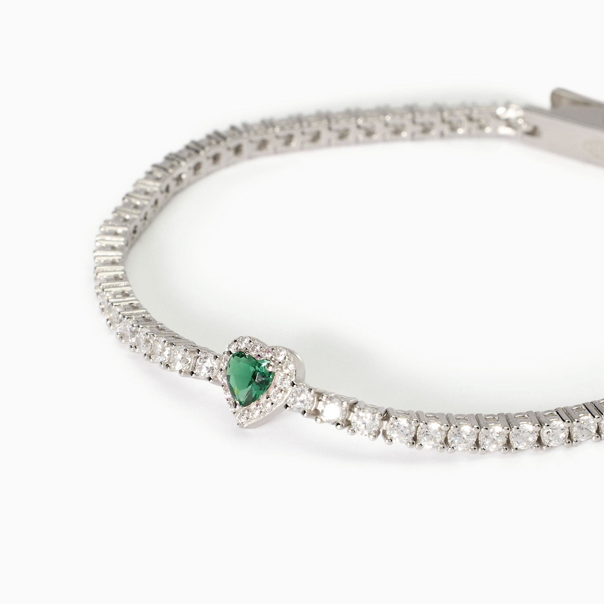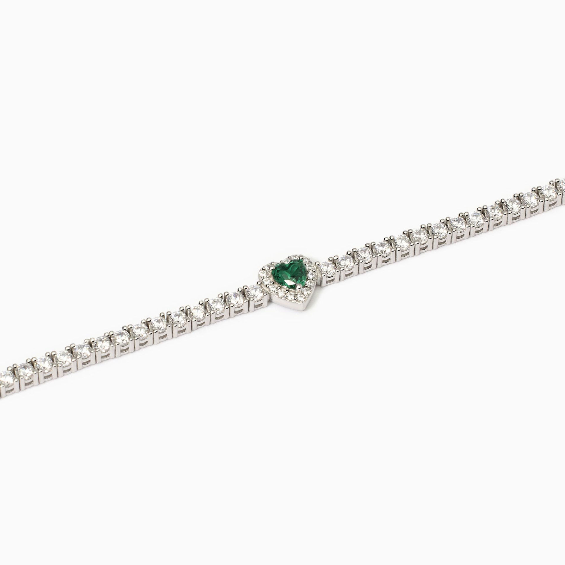 Bracciale tennis da donna in argento rodiato con smeraldo sintentico centrale taglio cuore e zirconi.