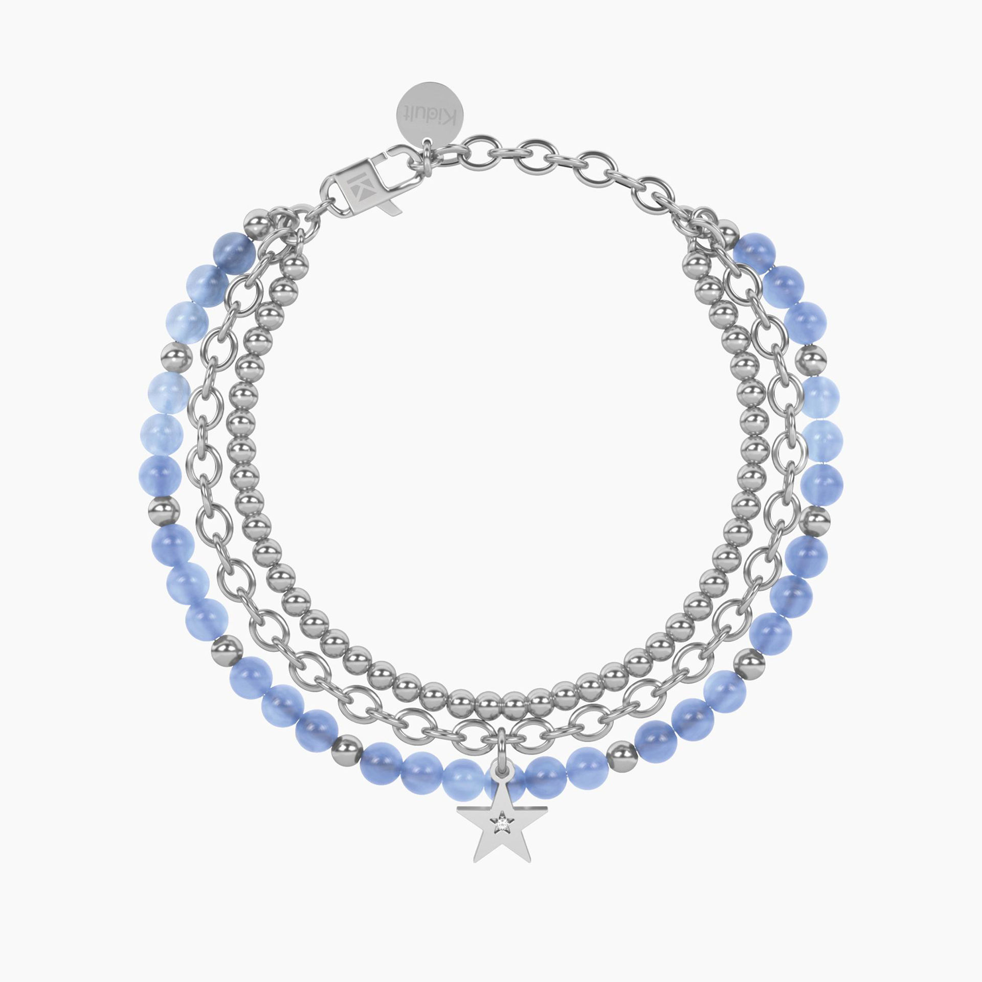 Bracciale da donna regolabile in acciaio con catena forzatina e doppio filo con sfere, giada azzurra e ciondolo a forma di stella con cristallo.