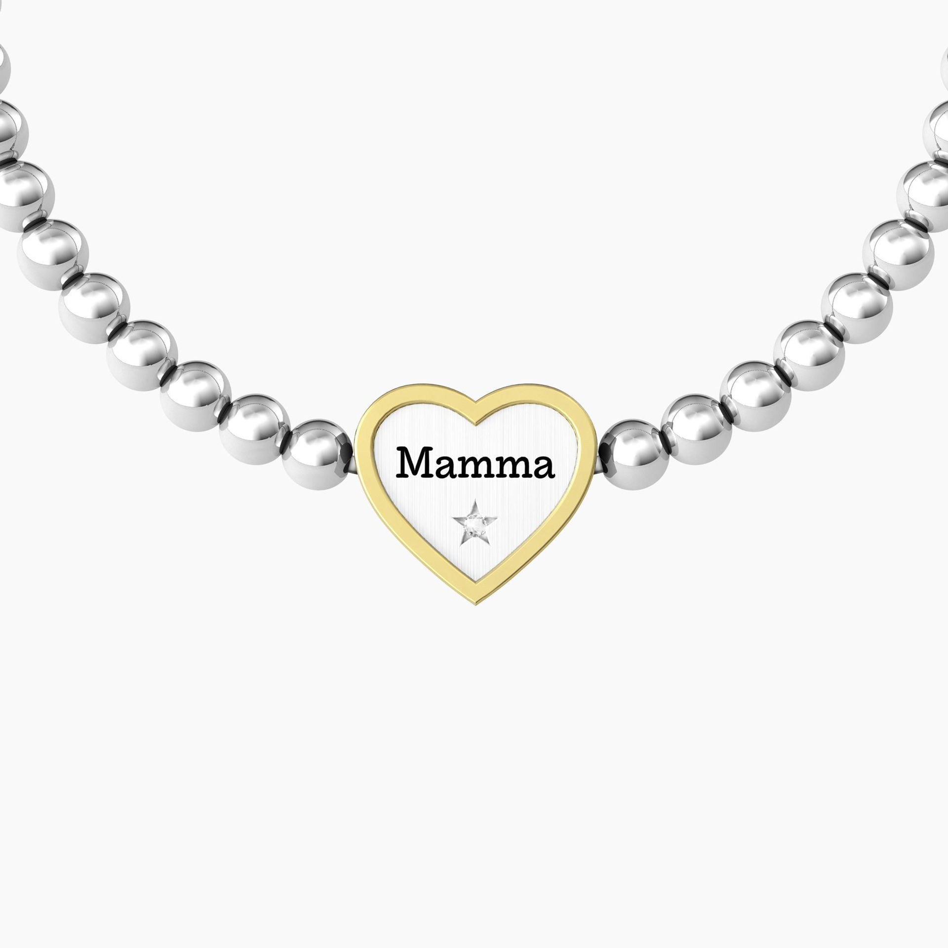 Bracciale elastico in acciaio con sfere lucide e ciondolo satinato a forma di cuore con cristallo bianco, bordo in PVD giallo e scritta “Mamma”.