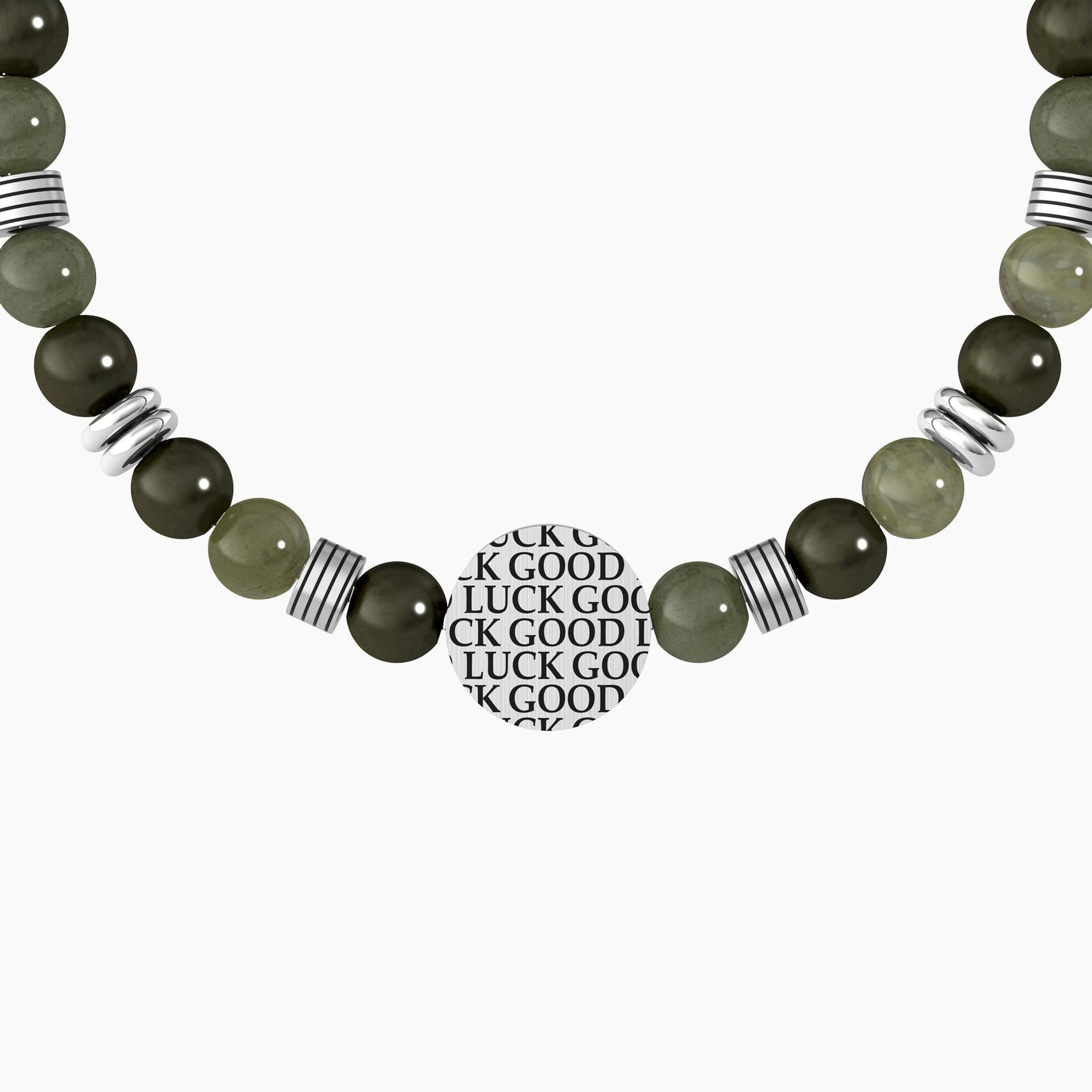 - Bracciale elastico con sfere in diaspro verde alternate a cilindri con rigati e anelli in acciaio, con piastra tonda di colore nero con quadrifoglio.