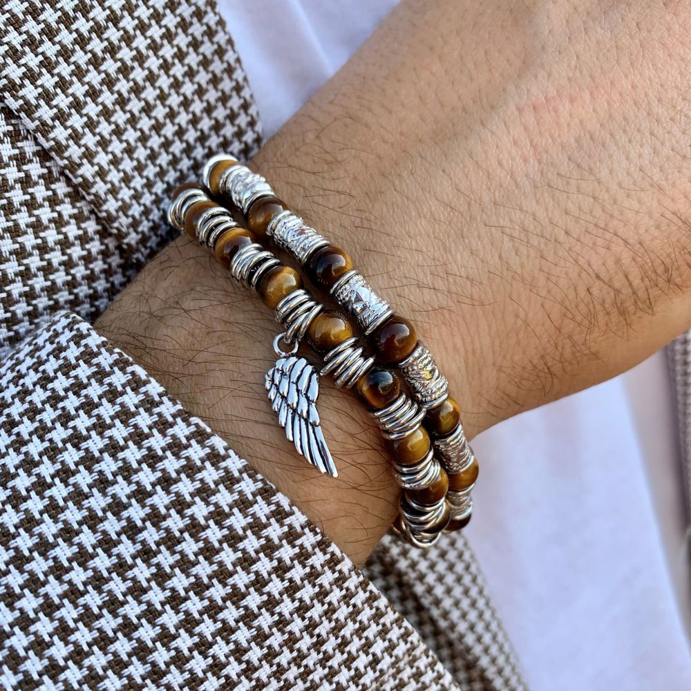 Un gioiello dal carattere forte, in grado di illuminare i tuoi look grazie all’alternanza di barilotti in argento finemente decorati e perle di occhio di tigre, con diametro di 6 mm.