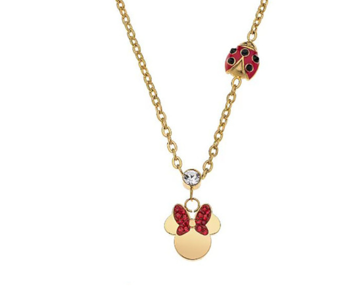 Il gioiello presenta uno charm centrale di colore gold raffigurante Minnie Mouse con fiocco smaltato in rosso e impreziosito da zirconi di colore rosso.