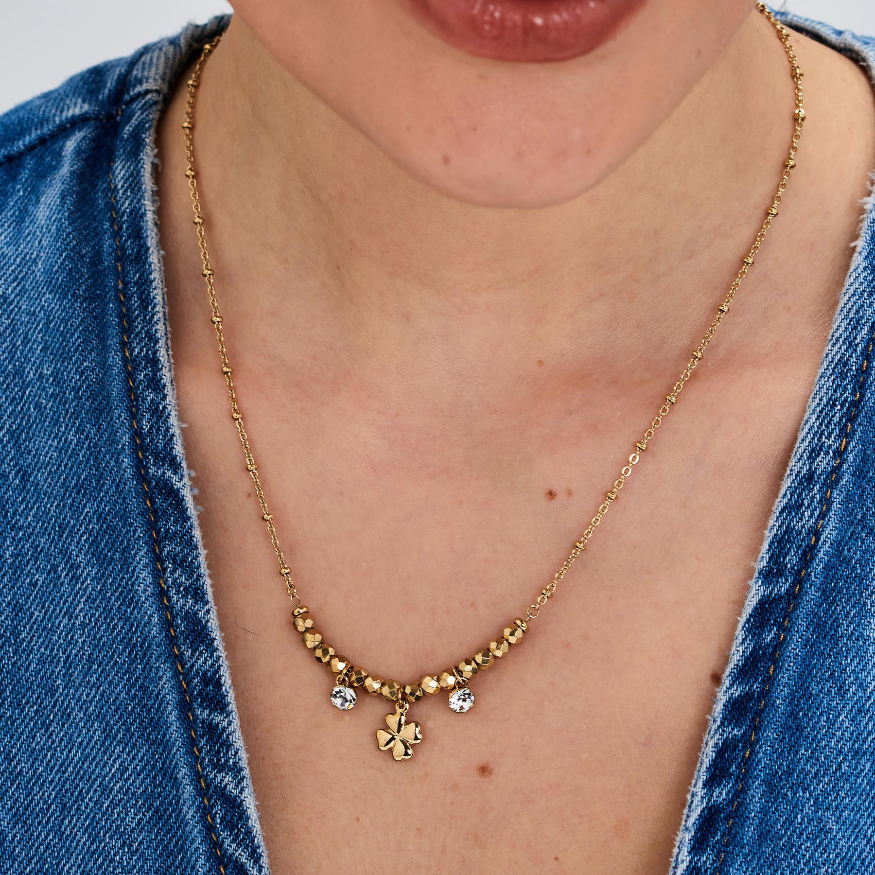 Collana girocollo in acciaio 316L e finitura pvd oro 14K, con pendenti con quadrifoglio e cristalli.