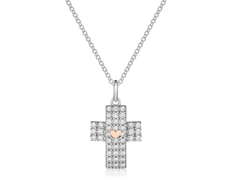 La collana con pendente croce con zirconi bianchi e cuore in argento rosato è un gioiello elegante e raffinato che combina la bellezza classica della croce con un tocco romantico dato dal cuore centrale.