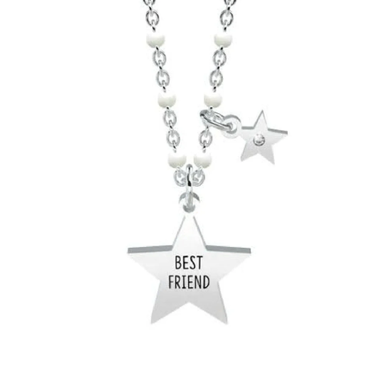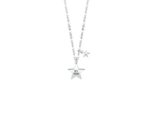 - Il gioiello è in acciaio inossidabile 316L composto da una catena rolò con inserimenti in smalto bianco e due ciondoli a forma di stella, di cui uno con incisione smaltata “Best friend” (traduzione: migliore amica) e l’altro con cristallo.