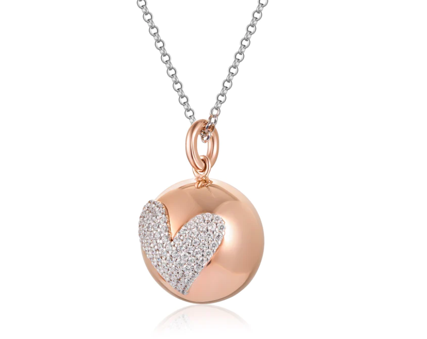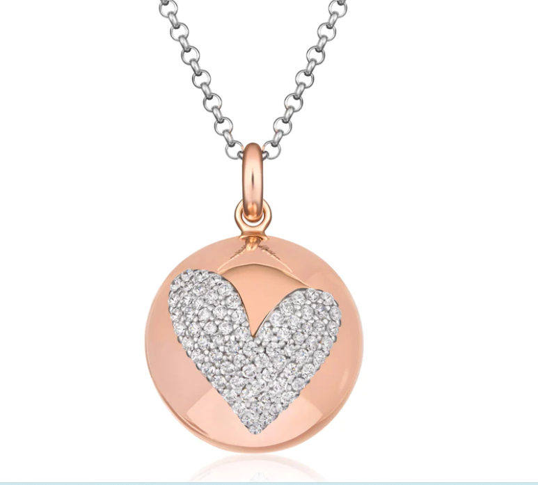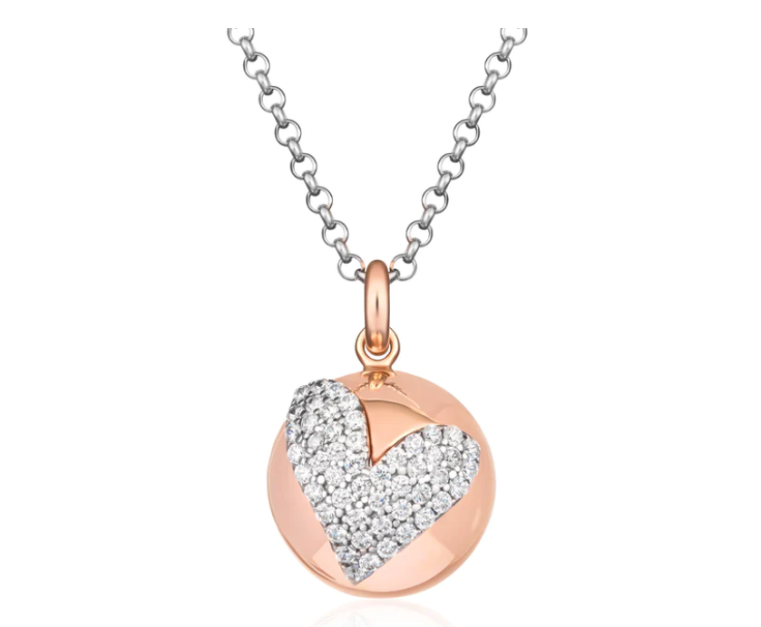 Il pendente è impreziosito da un cuore centrale, simbolo dell’amore e dell’affetto.La superficie del cuore brilla grazie alla presenza di zirconi bianchi scintillanti, conferendo un tocco di luce e raffinatezza al gioiello.