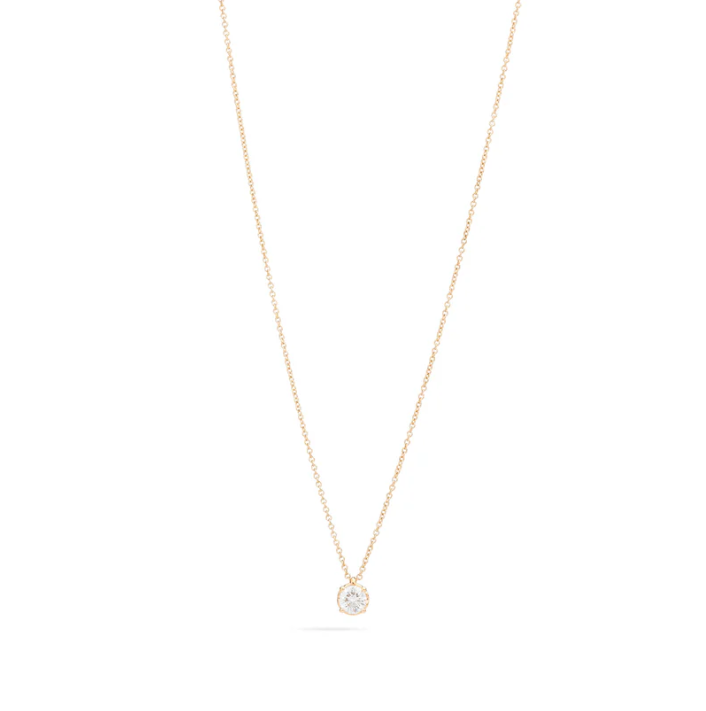 Il gioiello è in oro giallo 750‰ (18kt) impreziosito da un diamante naturale dal taglio brillante di caratura totale 0,19. Lunghezza 45 cm con chiusura a moschettone.