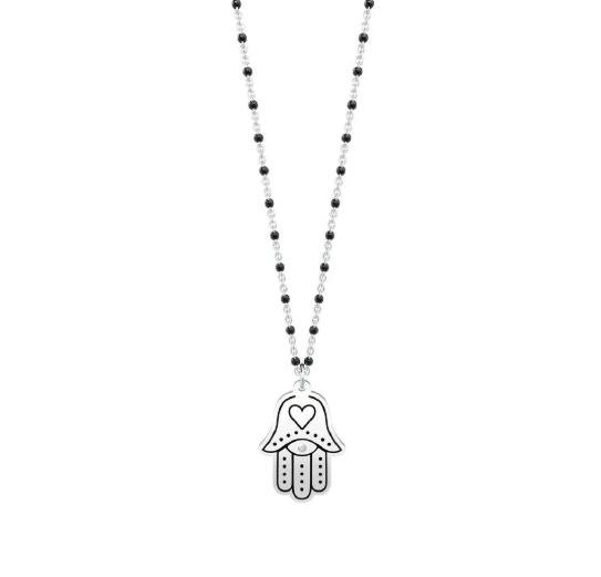 - Il gioiello è in acciaio inossidabile 316L composto da una catena rolò con inserimenti in smalto nero e ciondolo a forma di mano di fatima con cristallo.