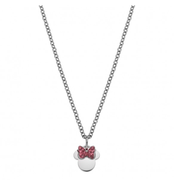 Collana da donna e bambina realizzato in acciaio anallergico rodiato. Pendente a forma di Minnie impreziosito da cristalli viola.