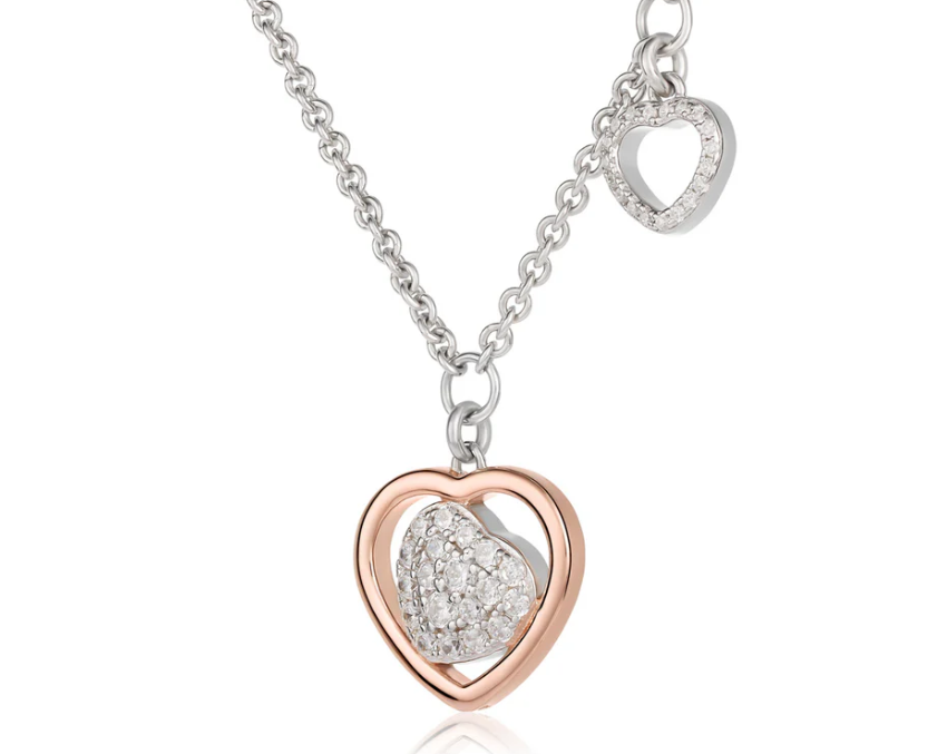 Una nuova interpretazione dell’iconica Trilogia d’Amore in cui il cuore in argento rosato incornicia un cuore di pavè, posto in modo obliquo per un effetto unico e sofisticato.