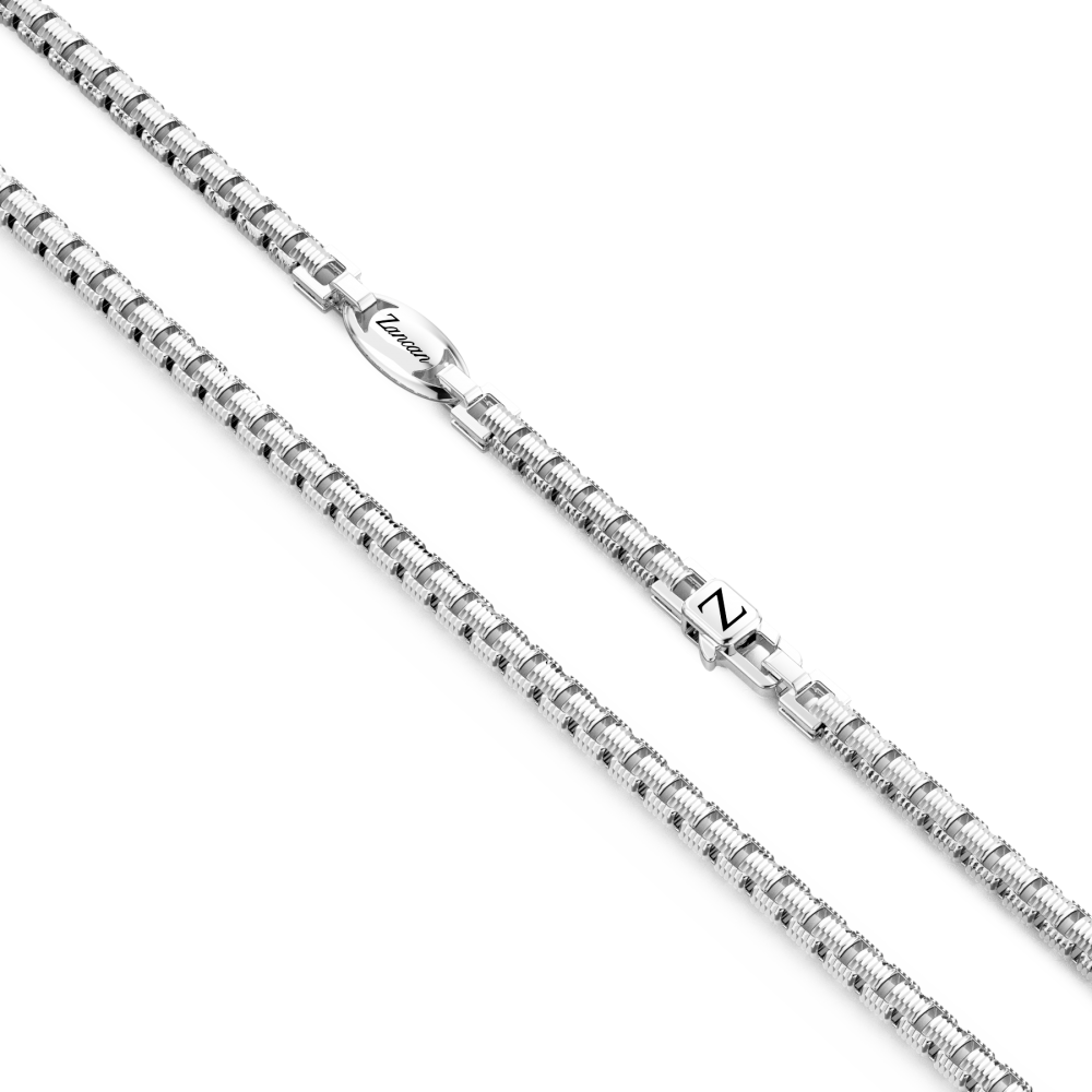 La collana solo maglia è caratterizzata da un pattern zigrinato.