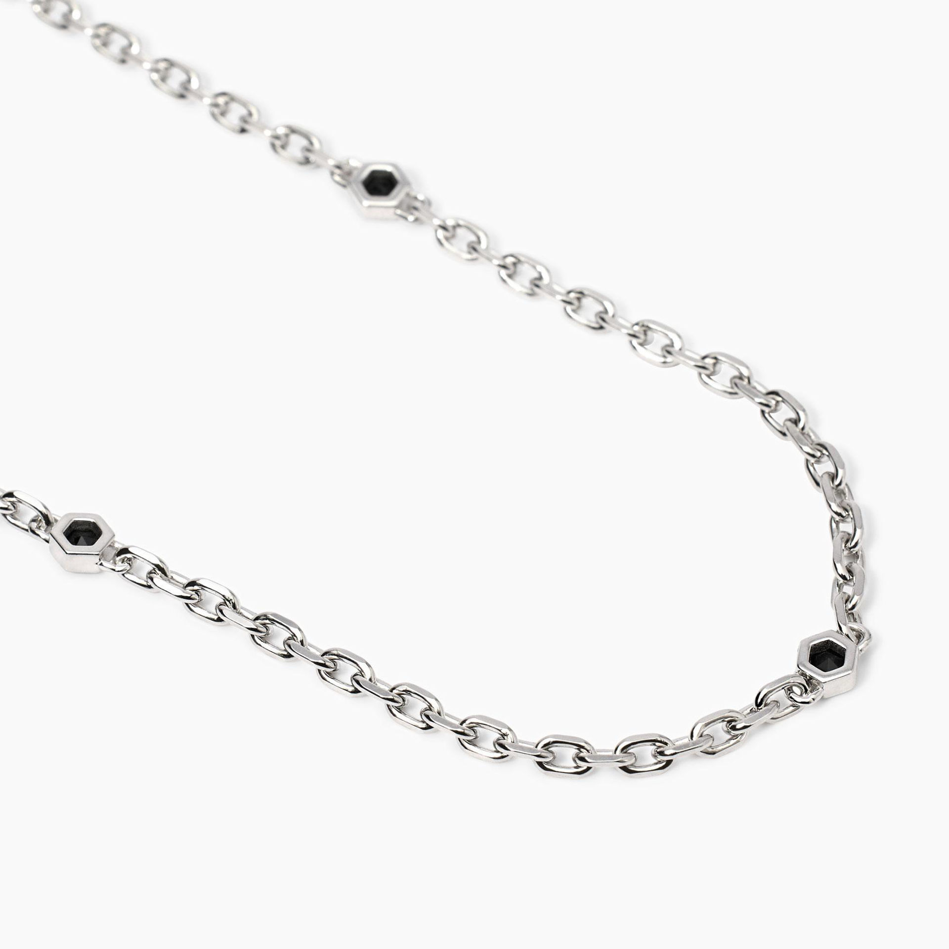 Collana in argento rodiato con catena forzatina e zirconi neri esagonali.