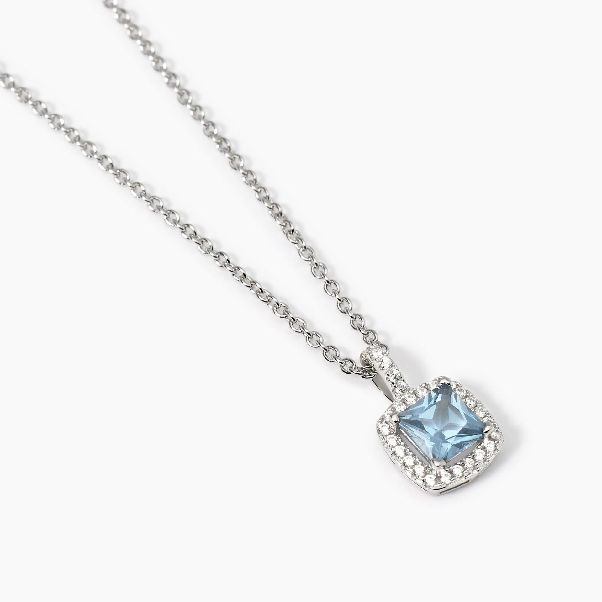 Girocollo in argento con catena rolò e ciondolo in acquamarina sintetica taglio princess con zirconi bianchi.