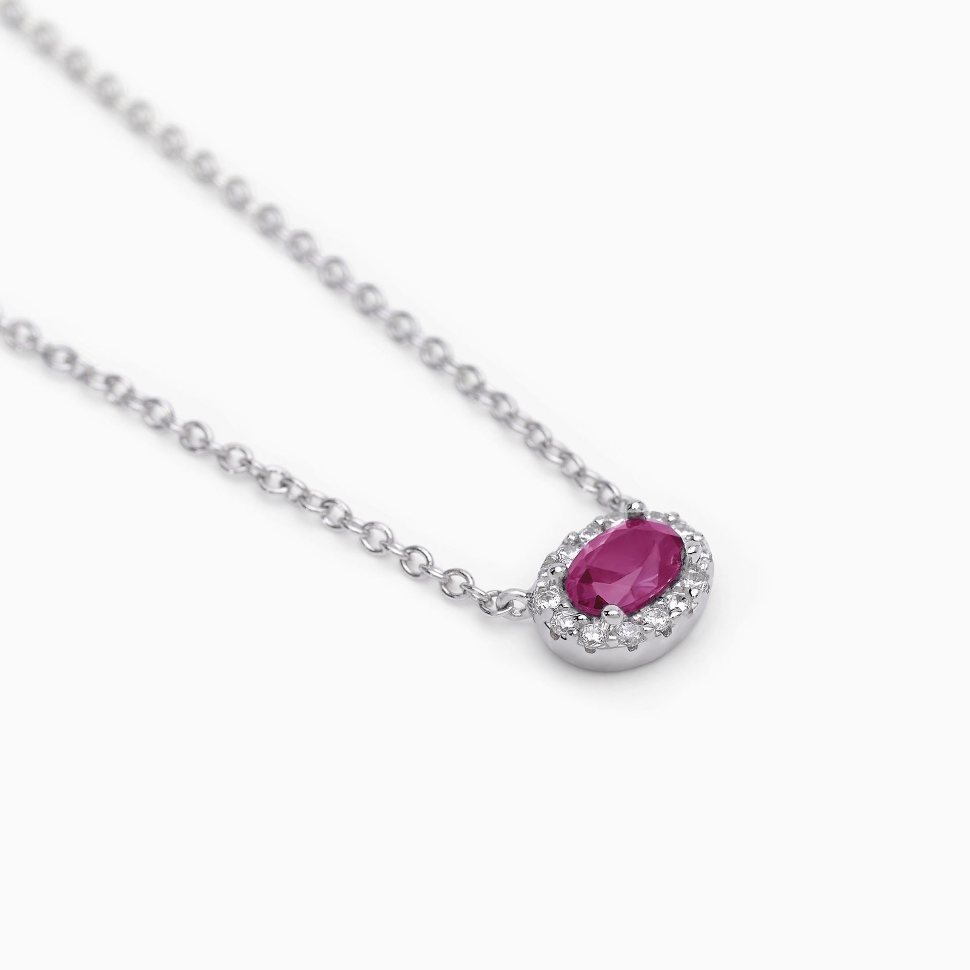 Girocollo da donna in argento rodiato con catena forzatina e ciondolo con rubino sintetico ovale e zirconi.