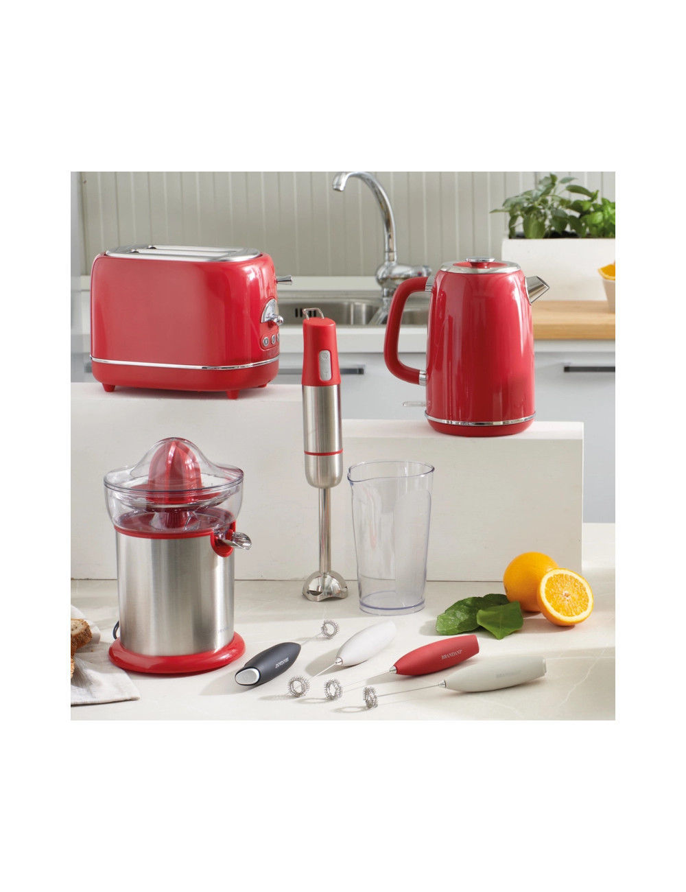 Linee curvilinee e colori accesi creano un design tanto strong quanto elegante dall’inconfondibile tocco vintage: la collezione di piccoli elettrodomestici 1950 signed by Brandani porta in casa lo stile degli intramontabili anni 50, quando ogni oggetto rifletteva innovazione, audacia e tanta voglia di libertà. Il mixer ad immersione 1950 presenta una morbida silhouette dal lucido acciaio con graziosi dettagli color rosso in finitura opaca; pensato per unire classe e funzionalità, si introduce in una linea tutta da scoprire perfetta in ogni cucina!