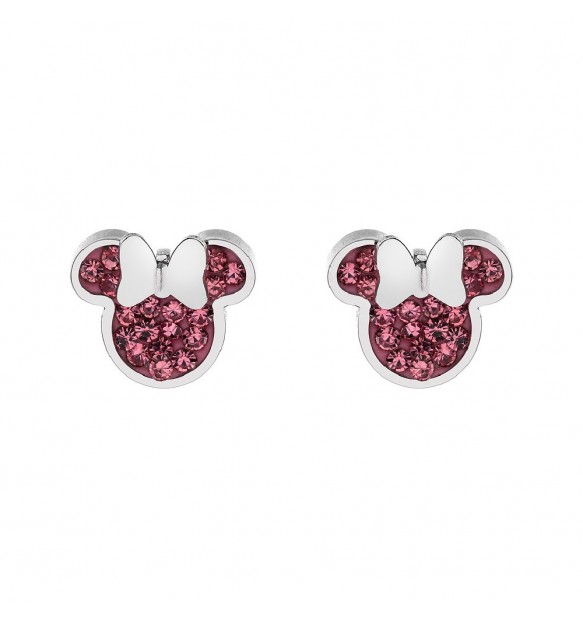 Orecchini a lobo da donna e bambina realizzati in acciaio anallergico rodiato a forma di Minnie impreziosito da cristalli rosa.