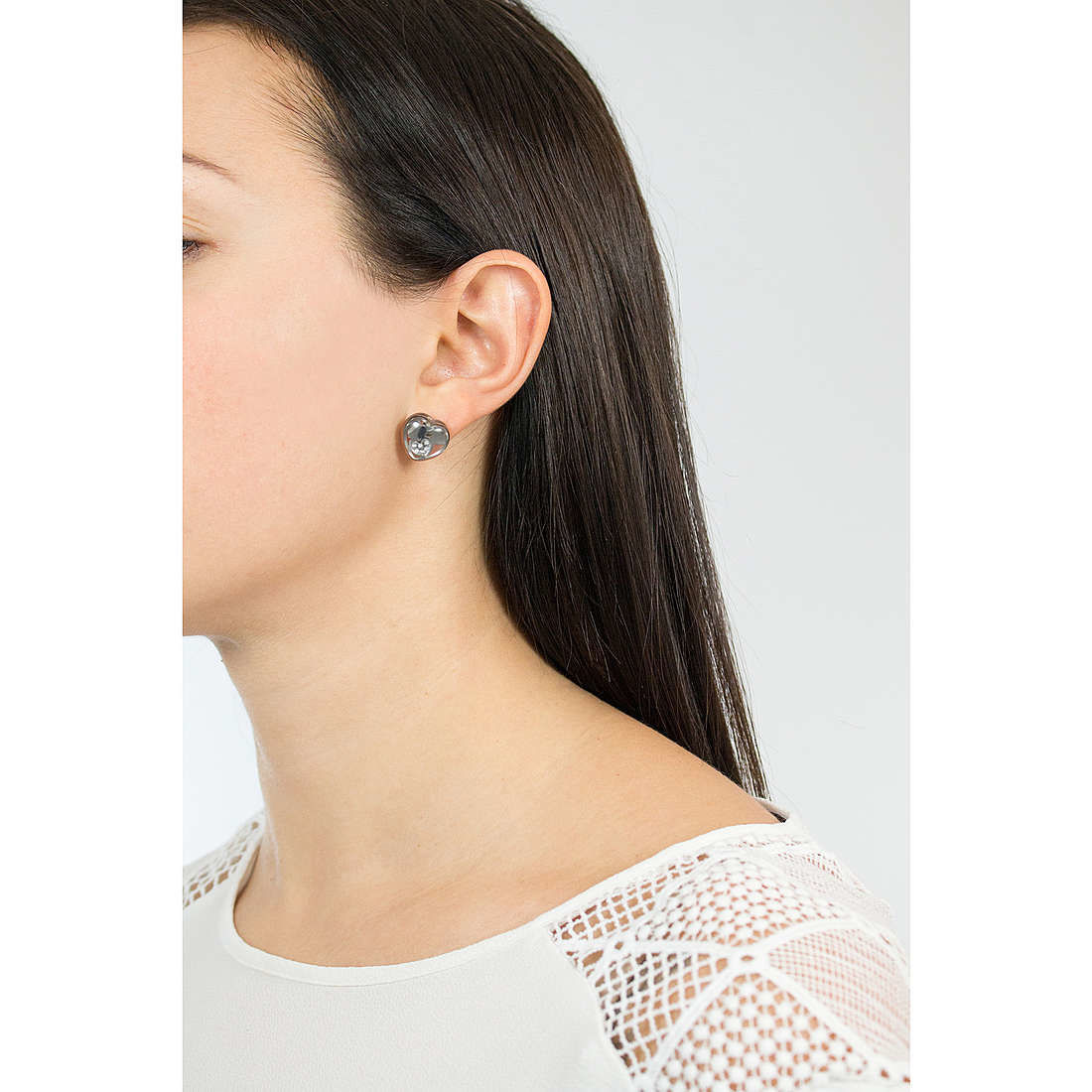 Orecchini Ops Objects da donna della collezione True, a forma di cuore in metallo di colore argento. Il cuore è ricoperto in resina trasparente e presenta al suo interno tre cuori di dimensioni differenti uniti tra loro, di cui uno con cristalli. Orecchini della misura di circa 2 cm, con chiusura a vite sul retro.