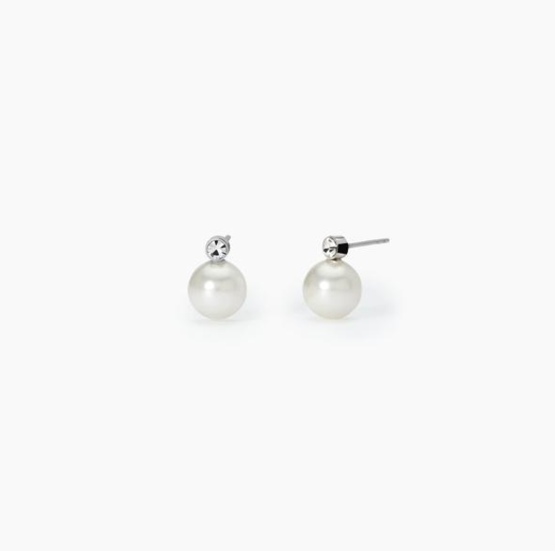 Orecchini in acciaio 316L con perle conchiglia Ø 10 mm e cristalli bianchi Ø 3 mm.