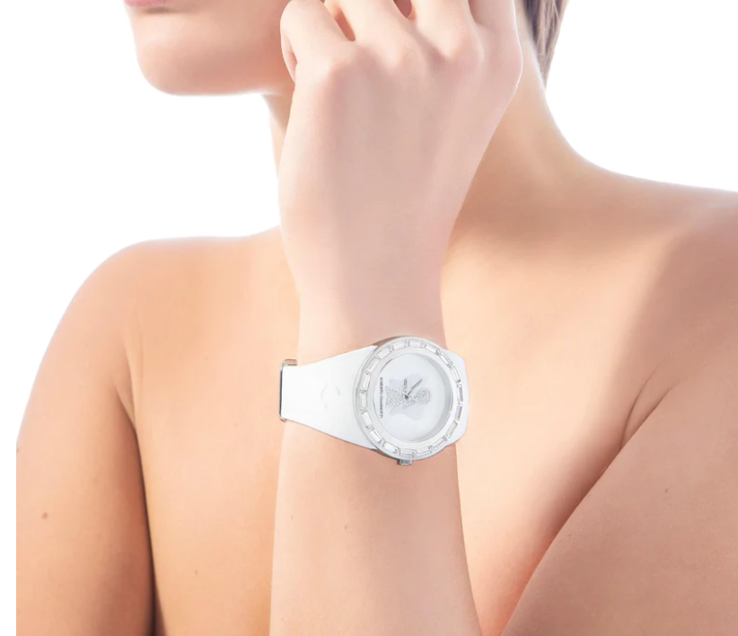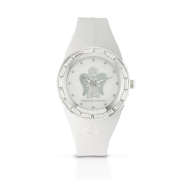 Orologio Angelo con cassa in acciaio, cinturino bianco e quadrante bianco in madreperla.