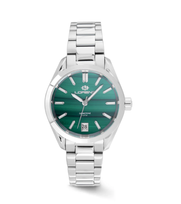 La collezione Ginevra si ispira ai grandi classici del design ginevrino, reinterpretandoli in chiave contemporanea. Orologi dal carattere versatile, disponibili con bracciali sportivi o eleganti, perfetti per ogni occasione e sempre al passo con lo stile. Il Ginevra Gemstone è un segnatempo dal fascino intramontabile, animato da un movimento al quarzo Miyota 2315 a tre sfere con datario a ore sei. Le finiture di alto livello – come la corona e il fondello a vite, il vetro zaffiro e la chiusura solida – testimoniano l’attenzione ai dettagli tipica di Lorenz. Il modello 030265AG si distingue per il suo quadrante in vera agata naturale, che rende ogni orologio un pezzo unico e irripetibile. Le venature e i disegni della pietra, sempre diversi, donano al segnatempo un’eleganza naturale e raffinata. La malachite, protagonista di questo modello, è una pietra naturale straordinaria, riconoscibile per le sue intense sfumature di verde e le venature concentriche che la rendono unica e affascinante. Fin dall’antichità è considerata una pietra di trasformazione e protezione, simbolo di energia vitale, equilibrio e rinnovamento interiore. Ogni quadrante in malachite è un esemplare irripetibile, con disegni naturali che conferiscono al segnatempo un carattere esclusivo e raffinato. Ogni orologio Ginevra Gemstone è unico per colore e venature; l’immagine è puramente indicativa.