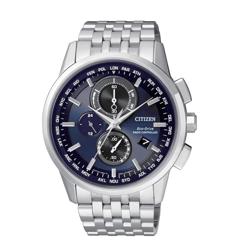 Funzioni: Radiocontrollato a 5 canali: ricezione segnale orario USA, Europa, Giappone, Cina. World time con orario di 26 città del mondo e ora UTC. Cronografo a 1/5 di sec. Calendario perpetuo.